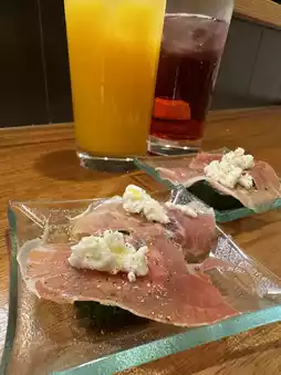 There's a persimmon under the prosciutto and a mandarin orange under the mozzarella.