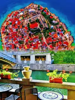 (Aerial shot of Belgrade Old Town + slow-motion café scene)