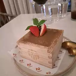 +$48 Dessert is the day cake Hojicha Tiramisu cake served on a small wooden plate with a hojicha aroma and moderate sweetness.