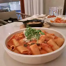 The crab meat is tossed with smooth cream, and the juicy thick tube macaroni is served with spicy tomatoes.