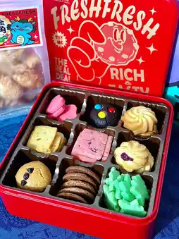 Assorted cookie gift box, which contains nine flavors, ๐ช shapes are very cute, Christmas tree and pink heart shape is very cute. Handmade butter cookies are moderately sweet๐ง, fluffy and crispy.