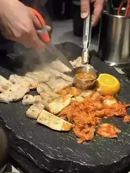 The restaurant is themed around rocks, with a dark environment that gives a mysterious vibe. The highlight here is Jeju BBQ, where the meat is grilled on a rock slab, which is quite unique! After ordering, the staff immediately serve a variety of appetizers and seasonings, including citrus salad, raw beef, spicy squid, pickled radish, and more. There is also a large portion of spicy kimchi, served hot on the rock slab, fragrant and flavorful.