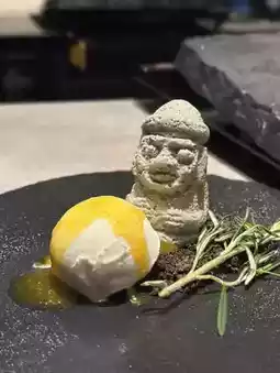 The design is adorable; the statue is a mousse made from black sesame with a rich taste, accompanied by vanilla ice cream and crushed Oreos. The presentation is perfect.