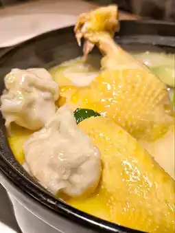 It says it serves four to six people 🤗🤗 The portion was indeed very generous~ The two of us shared it~ Each of us drank four to five bowls of soup 🙌🏻 The broth was full of chicken essence~ rich and nourishing! The half chicken meat was very tender and smooth~ Plus wontons and baby bok choy 🥬 with plenty of ingredients!!