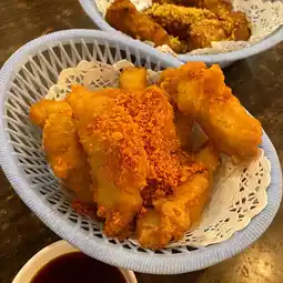 The salt and pepper fresh squid is fried crispy with a thin batter, and the squid is chewy 🐙