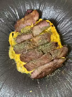 🔸 Slow-Cooked Beef Tenderloin with Mashed Potatoes and Garlic Sauce on Toast $148