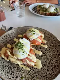 The hotel features two restaurants. For breakfast, we had smoked salmon eggs benedict, and for dinner, we enjoyed mushroom risotto. We also ordered burgers and French fries from the bar. Everything was delicious, making dining at the restaurants worthwhile! By the way, the bar offers happy hour deals, so you can enjoy beer at a discounted price.