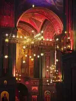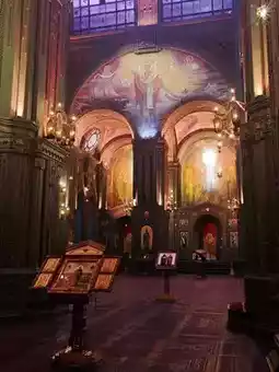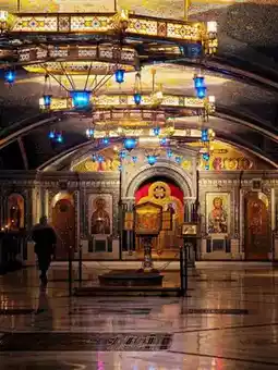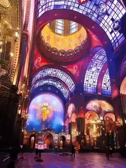 2️⃣ Main hall mosaic dome: Wide-angle shots of dome frescoes with angels and fighter jets in the same frame.