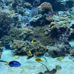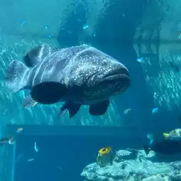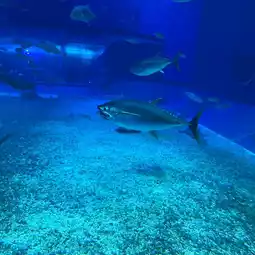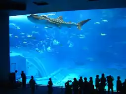 I've always wanted to go to the Churaumi Aquarium, so I went! ☀️ I was so excited to see the famous whale sharks up close! 😳🦈 There's a cafe attached to the tank inside the aquarium, so I took a break and enjoyed the view. ✨ It's so close, it's amazing how impressive the fish are when they swim by! 😂 There are so many colorful fish, it's truly Okinawa! That's what I thought! 💫