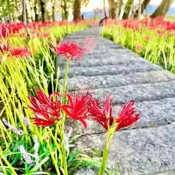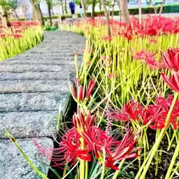 The red spider lilies are all around the stone promenade d(>∀<)b