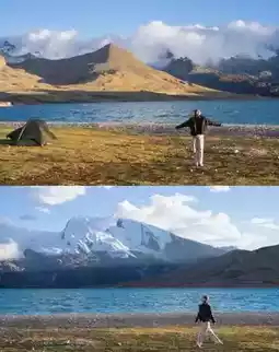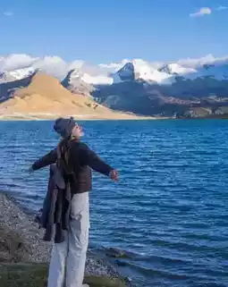 ✅Photo pose: Face the lake with your back to the camera, pretend to reach out to touch the snow mountain