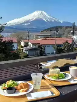 1️⃣ The Park – Famous at Lake Yamanaka, this spacious terrace café offers a direct view of Fuji. Their soufflé pancakes are a must-try 🍰.