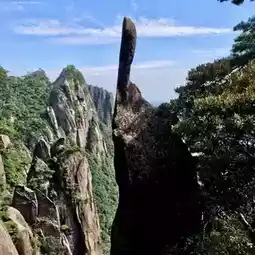 Taoist Priest Worship the Moon, is a 30m high and 10m wide granite peak that looks like a Taoist priest sitting solemnly in an attempt to become enlightened, facing the firmament (photo 1, 2, 3).