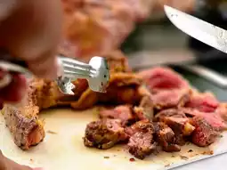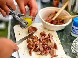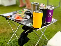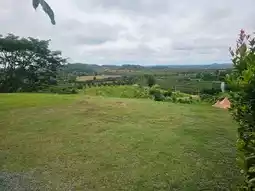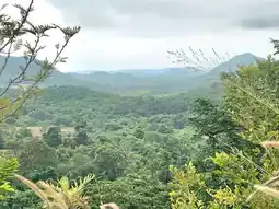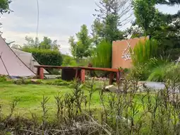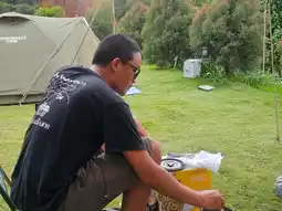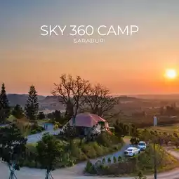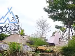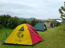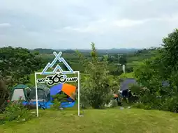 A tent site on a hill with a view of the mountains. You can see the view in 360 degrees. There is also a cafe on the ground.