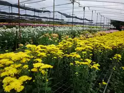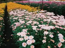 ✨ A flower garden nestled among the mountains, featuring blooming chrysanthemums all year round. The highlight is the colorful flower fields planted in beautiful patterns, creating a refreshing and romantic atmosphere.