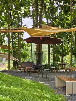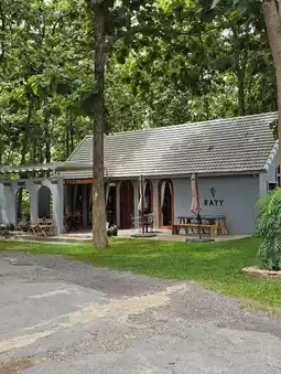 A vineyard cafe with a super chill atmosphere, surrounded by lush trees, located in Muak Lek District, Saraburi Province. The cafe is decorated in shades of gray, contrasting with the lush greenery, giving it a Chiang Mai-like feel. There are both outdoor and indoor seating areas. The outdoor area is camping-style, offering mountain views and a green vineyard, while the cool breeze blows.