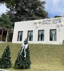 WYNN Cafe, a hillside cafe in Muak Lek, Saraburi, near Khao Yai. I'm amazed when I arrived. The striking white rectangular shop sits on a hillside amidst nature. The view is already chill enough, but once you step inside, it's even more amazing. Behind the shop is a small hill with seating where you can walk up to take photos.