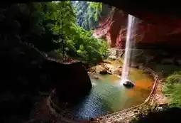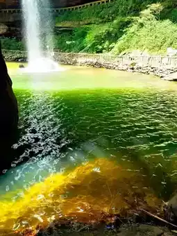❇️Sudong Feihong🌈, just like the Milky Way from the fairyland pouring down to the human world😲. On the red cliff, a waterfall hangs straight in the air, and then plunges into the emerald green pool like white silk, and the splashing water is like stars. The roar of the waterfall hitting the turtle-shaped rock is like a majestic movement played by nature. The breeze is refreshing, and the greenery in the mountains and valleys is cool. People can't help but sigh, what kind of fairy residence is this, making people instantly forget the restlessness and troubles of the world👍.
