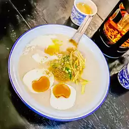 Driving to find something to eat at night in Phuket, I passed by a shop called Jern Ling, located in the Samkong area. From the front of the shop, it looks like a very ordinary shop, a bit Chinese style, like a tea shop. We ordered boiled egg congee + salted egg, vermicelli, grilled meatballs, and toast.