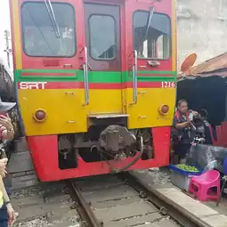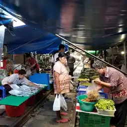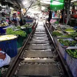 The unimaginable Maeklong Market, where the roofs of tents that extend almost to the very edge of the tracks are folded up every time a train passes through the market, can be reached in just under an hour from Bangkok.
