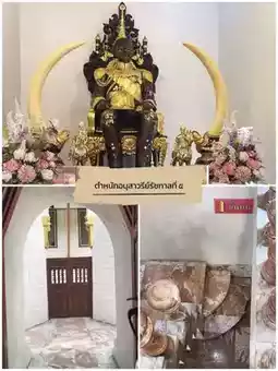 We then proceed to the second stop, exiting the Reclining Buddha Vihara, just before the left exit. The large, bright red sign reads, "King Rama V Monument Palace." The palace has two floors. The ground floor welcomes you, clean and beautifully decorated with pink carpets and roses. It houses a collection of information on His Majesty's life, including the "Pak" cookbook, an ancient Thai cookbook. The entrance is adorned with a white, pointed archway and a miniature European-style dome. Upon entering, we paid our respects to King Rama V, seated in his stately pose, adorned with a pair of ivory tusks, and prayed for positive energy and peace of mind.