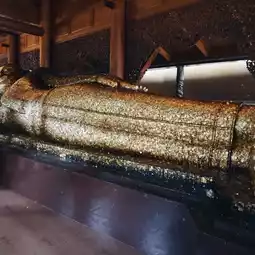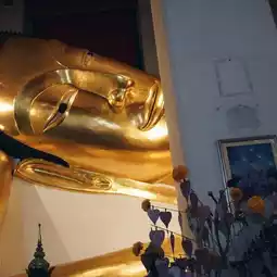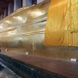 Before going to worship the real one in the temple, the temple will have you light incense, apply gold leaf, and bring flowers to offer to the replica of the reclining Buddha in front.