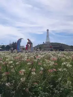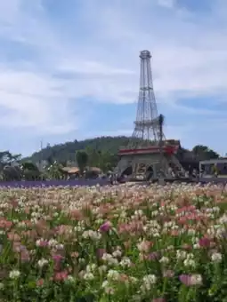 Phas Thong Farm, Mukdahan is a large flower garden covering an area of 20 rai. It is located in Ban Dong Man, Chayangkul Road, Kham Ahuan Subdistrict, Mueang Mukdahan District, Mukdahan Province. The farm is highlighted by a 22-meter high replica of the Eiffel Tower, giving it an atmosphere similar to traveling abroad. It is open daily from 08:00 to 18:00. Entrance fee: Adults 80 THB / Children 40 THB. The farm features various flower gardens including Cleome, Blue Salvia, Sunflowers, Cosmos, an orange grove, a café, and activities such as feeding sheep and goats. There are also paddle boats, ATV rides, and bicycle rentals. The replica Eiffel Tower and a restaurant make it a one-stop destination. However, visitors should contact the farm or check their Facebook page for updates, as the flower gardens are only open during the winter season. The café remains open year-round.