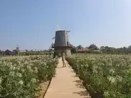 It stands out with a large windmill amidst a field of various flowers, including sunflowers, marigolds, cosmos flowers and blue salvia.