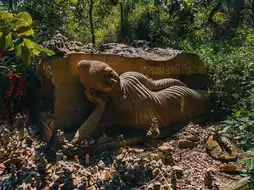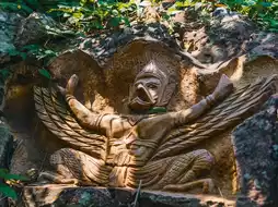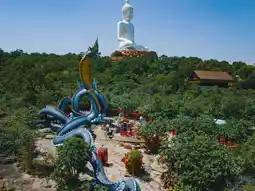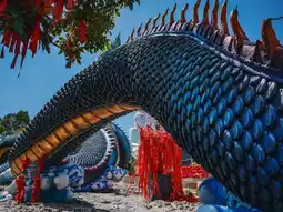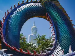 The enormous Naga statue at Phu Manorom Temple in Mukdahan Province 🐍 is a breathtaking sight. Known as "Grandfather Sri Mukda," this sculpture depicts a Naga coiled gracefully on a rocky plateau atop a mountain. The statue measures 122 meters in length and 20 meters in height, with its neck elegantly raised, standing out amidst the lush forest and facing the Mekong River. Its greenish-blue hue shimmers beautifully under sunlight, giving it a lifelike appearance. The intricate patterns on its body are exquisitely detailed and truly magnificent.