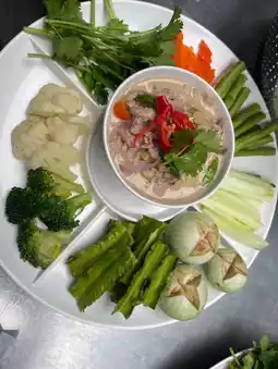The menu offers a wide selection of Thai, Isaan, and large family-friendly dishes. We ordered the highly recommended "Stir-fried Stink Beans with Shrimp Paste" (Stir-fried Shrimp with Shrimp Paste). The flavor was fragrant and well-balanced, not too salty, and the shrimp were large and firm. Another dish was the "Tom Yum Pla Kang" (Spicy Catfish Soup), a rich broth with a strong aroma of Thai herbs. A wide selection of drinks is also available. The guava juice with plums was incredibly refreshing. 🥩