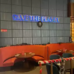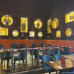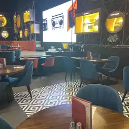 It is a pub with a large screen where you can watch sports games and you can also find Western-style food.