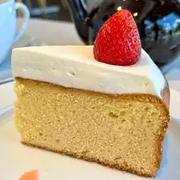 Victoria Cake is an eat-in only menu item. The cake is a tall sponge cake with a thick layer of cream and strawberries on top 🥰.