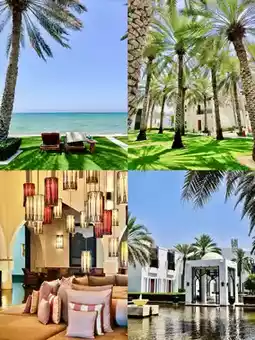 🍽️ We also went to the Chedi Muscat hotel for lunch. As soon as you enter, the frankincense mixed with the salty sea breeze instantly relaxes you—they truly understand the relaxed feeling of a vacation! White buildings with Arabian arches, corridors lined with tall palm trees, and sunlight filtering through the leaves creating patterns on the ground—every step feels like walking through a time tunnel.