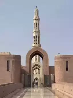 The mosque's grand design, featuring a massive dome and a 90-meter-high minaret, is a striking landmark visible from afar and a "architectural sculpture" reflecting the grandeur of Islam in Oman.