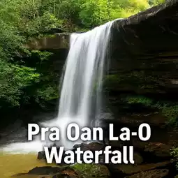A medium-sized waterfall hidden deep in the forest, the water flows over a thin, layered cliff, creating a beautiful, almost-painting experience. Perfect for those who appreciate peace and true nature.
