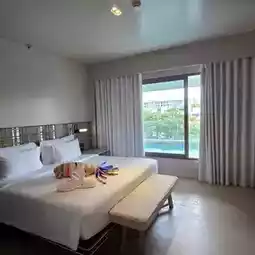 Veranda Resort Pattaya - Jomtien Beachfront. We booked a pool suite with a large bedroom and living room with bunk beds, a bathtub, a balcony, and a swimming pool. It was wonderful, private, and spacious, perfect for families with children. The hotel welcomed us with great hospitality, clean rooms, and excellent amenities. The breakfast was excellent and delicious. The environment was pleasant, and the staff were friendly.