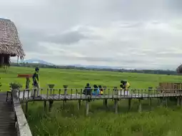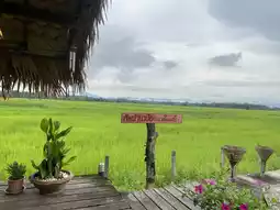 Hello everyone, today I will take everyone to visit Trang Province. And today I will take everyone to eat delicious food with a very chill atmosphere. Tung Na restaurant and here Somtam Napo restaurant is a halal food restaurant. This is a special somtam restaurant because there are many places to take pictures. There are more than a hundred menus. There are many photo zones and seating areas to choose from. And there is a wooden bridge to take pictures in the middle of the rice fields. The atmosphere is very good. Come and join us. The menu here is delicious somtam, especially the fried somtam menu, which is very delicious to eat with fried chicken. Delicious and satisfying. 🥗🍔🍗🍖🥞🥟