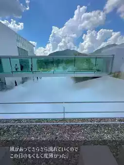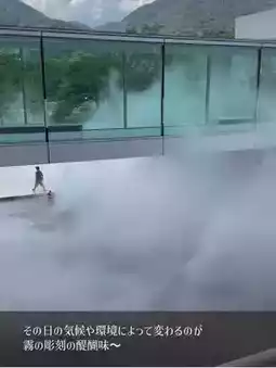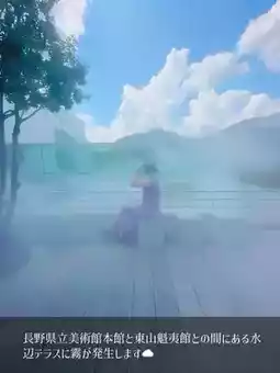 Fog appears on the waterside terrace between the Nagano Prefectural Museum of Art's main building and the Higashiyama Kaiikan Museum ☁️