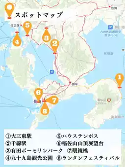 But it's actually a sake brewery and Arita ware theme park‼ ️It's a free spot to enjoy, so let's aim for some cool photos📸・Address: 340-28, Toya Otsu, Arita-cho, Nishi Matsuura-gun, Saga Prefecture・Access: 60 minutes by car from Nagasaki Airport・Opening hours: Timetable: Morning bus 9:00, Afternoon bus 13:00・Cost: 4,200 yen for adults, 2,100 yen for children【④ Kujukushima Tourist Park】When it comes to the most spectacular views of Nagasaki, this is the place to go⛰️Although it is said to have 99 islands, it is actually made up of 208 islands of various sizes! You can see the whole view from the tourist park 👀・Address: 1746 Nozaki-cho, Sasebo City, Nagasaki Prefecture・Access: 70 minutes by car from Nagasaki Airport・Opening hours: 8:00-20:00・Cost: Free