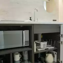 The rooms are equipped with a kitchen, microwave, and even a washer-dryer, making it ideal for long-term stays!