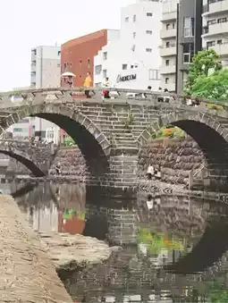 Spectacle Bridge is the first stone arch bridge in Japan and is famous for its reflection that forms the shape of glasses when the weather is good. Spectacle Bridge has been the filming location for many Japanese animations and is also a landmark of Nagasaki.