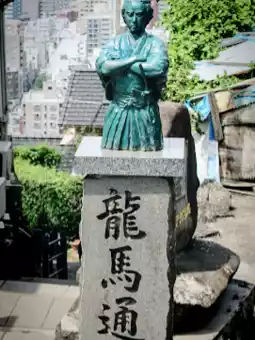 The surrounding area is dotted with Ryoma-related sites, including the remains of the Kameyamashachu and a statue of Ryoma Sakamoto. The stone-stepped slope leading from the intersection of Zenrinji Temple and Jinsouji Temple on Teramachi Street, past the remains of the Kameyamashachu, to Kazegashira Park, is known as "Ryoma Street" and is a historical walking trail through Nagasaki City.