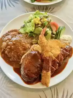 Hamburger steak, thin cutlet, and tomato spaghetti, hidden by the fried shrimp.