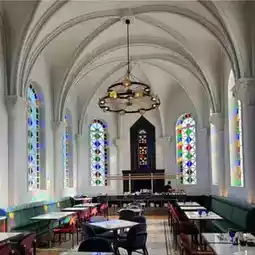 Taking advantage of the dining room that was once the sanctuary, the stained glass windows with modern style blend perfectly with contemporary design elements!