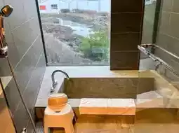Guests can stay in a Japanese-style suite, featuring tatami flooring, washi-covered walls and ceilings, and a bathroom made of Oki wood sandstone, creating a relaxed, serene, and luxurious Japanese space. The room spans over 70 square meters, with a nightly rate including breakfast at approximately 9,000 TWD per person on weekdays.