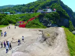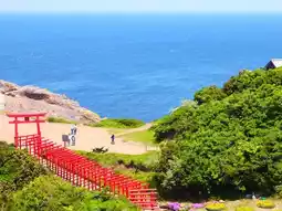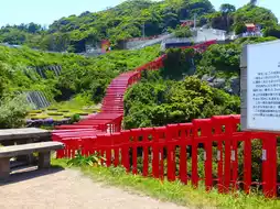Further back, the sea stretches out, and the red of the torii gates against the blue of the sea is incredibly beautiful, capturing your gaze.