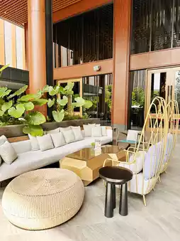 The interior of the building has an Asian-style wooden warmth and a handmade feel.