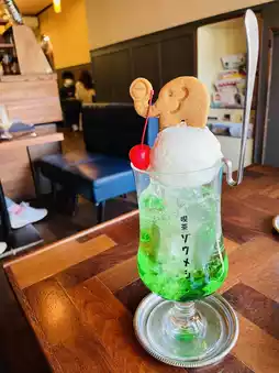 In addition to nostalgic menu items, you can enjoy slightly unusual dishes such as udon noodles stewed with miso and egg sandwiches with meat and miso. The popular cream soda is available in green, pink, and blue. The ice cream and elephant cookie on top were not too sweet and were so delicious that I ate it all in one go.