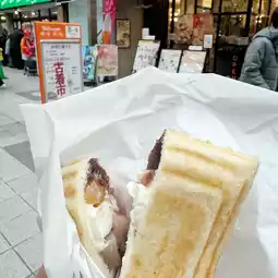 Taiwanese sweets shop. The photo shows a hot sandwich with red bean paste and butter. It has rare cheese inside and is deliciousโก