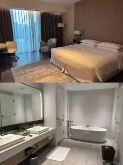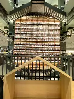 The staircase connecting the first and second floors is a giant bookshelf, and the mirrored ceiling makes it an Instagrammable spot.